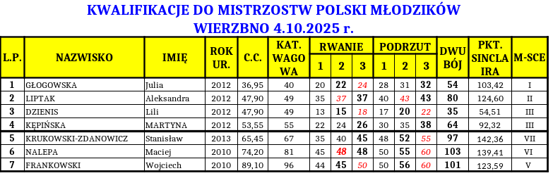 W sobotę, 4 października 2025 r. w Wierzbnie odbyły się TURNIEJ KWALIFIKACYJNY do MISTRZOSTW POLSKI MŁODZIKÓW w podnoszeniu ciężarów.