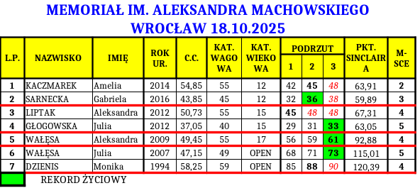 Serdeczne podziękowania dla klubu WKS Śląsk Wrocław – sekcja podnoszenia ciężarów za zaproszenie i świetną organizację zawodów . Cieszymy się, że mogliśmy wziąć udział w tym wyjątkowym wydarzeniu i w ten sposób uczcić pamięć trenera Aleksandra MACHOWSKIEGO, którego pasja i zaangażowanie w rozwój polskiego podnoszenia ciężarów wciąż inspirują kolejne pokolenia
